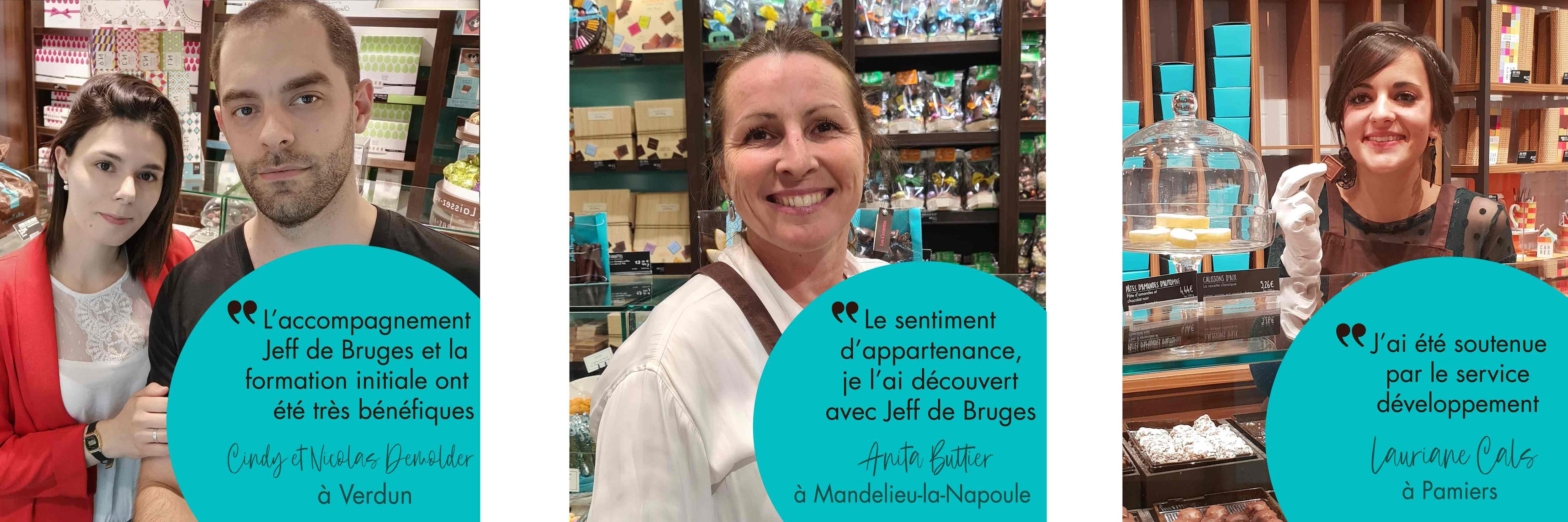 Chaque franchisé Jeff de Bruges reçoit une formation initiale de 6 semaines, au cours de laquelle sont abordés tous les aspects des différents métiers, en alternant théorie et pratique : caractéristiques des produits, techniques de mise en marché, vente, gestion et marketing. Pendant la formation pratique, vous serez dans l’un de nos magasins, en contact direct avec la clientèle. Une formation sur mesure pour vous former à l’art de la vente du chocolat par Jeff de Bruges.