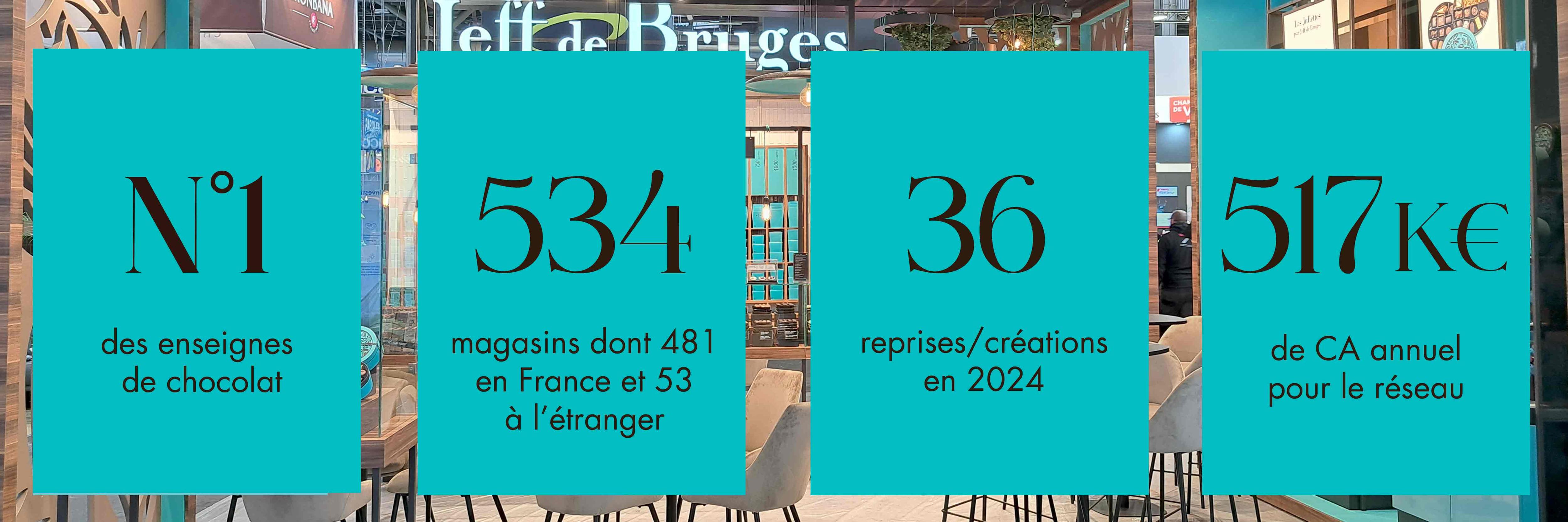 Nous avons ouvert notre première boutique de chocolats en 1986 et l’enseigne a immédiatement connu un grand succès. En 2012, nous avons inauguré notre première boutique en France sur la prestigieuse avenue des Champs Elysées, et 2 ans plus tard rue de Rivoli, à Paris. Actuellement, le réseau Jeff de Bruges compte 534 magasins dont 481 en France.